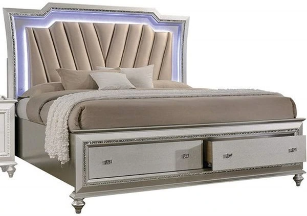 The Kaitlyn bed provides a commanding presence in any room. This contemporary storage bed features a channel tufted padded headboard and a low-profile footboard with storage drawers. Crafted with a glam look that is an ideal addition to any bedroom, the headboard is accented with LED lights and a crystal-like sparkling trim.Read More