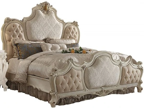 Features: Padded headboard/footboard, raised scrolled oversized molding trim, button tufted panels (side), nailhead trim, antique contrast finish