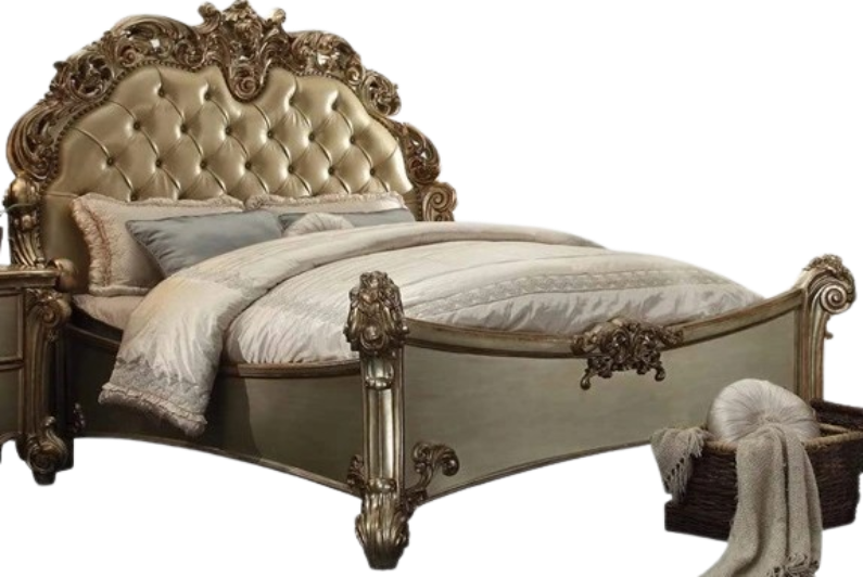 Features: Padded headboard, scrolled-oversized molding trim, crystal like button tufted and nailhead trim (headboard), antique contrast finish