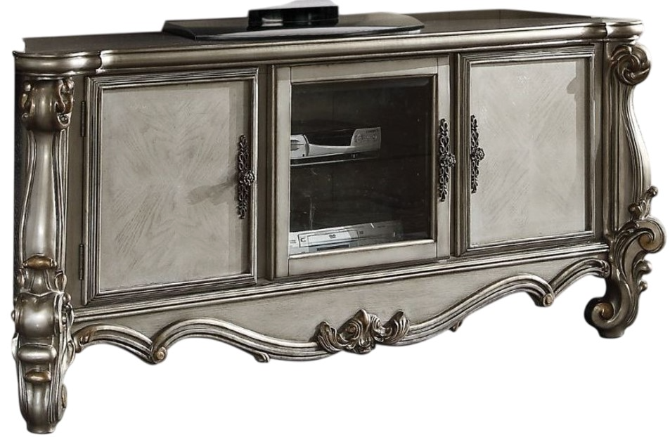 The Versailles the TV Stand was inspired by old European design. This collection features carved scrollwork accent on legs and trim base. Carefully crafted with selected wood and veneers in antique platinum finish with hand brush accents. Offers plenty of space to keep your entertainment components.Read More