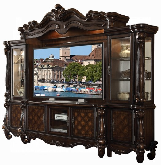 The Versailles the entertainment center was inspired by old European design. This collection features carved scrollwork accent on the bridge's crown. The collection pieces are carefully crafted with selected wood and veneers in Cherry Oak finish with hand brush gold accents.Read More