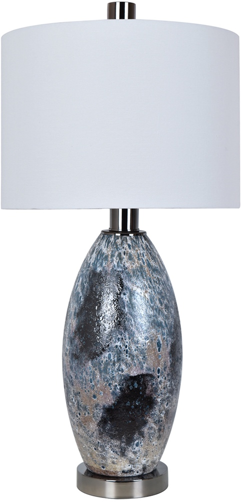 Logan table lamp 32.5", glass and metal, black and white reaction glass with white linen shade.